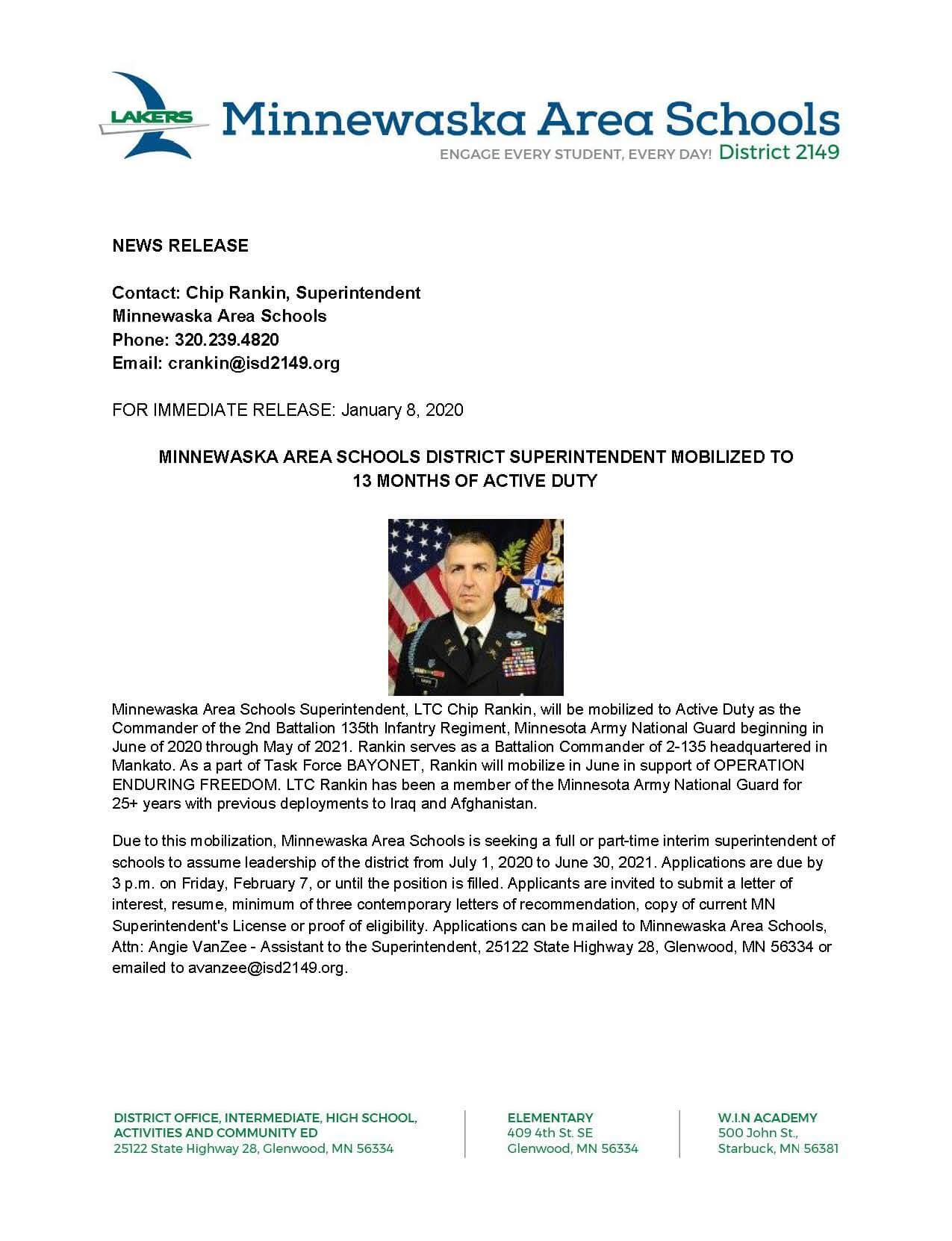 MAS DISTRICT SUPERINTENDENT MOBILIZED TO 13 MONTHS OF ACTIVE DUTY, SEARCH FOR INTERIM SUPERINTENDENT
